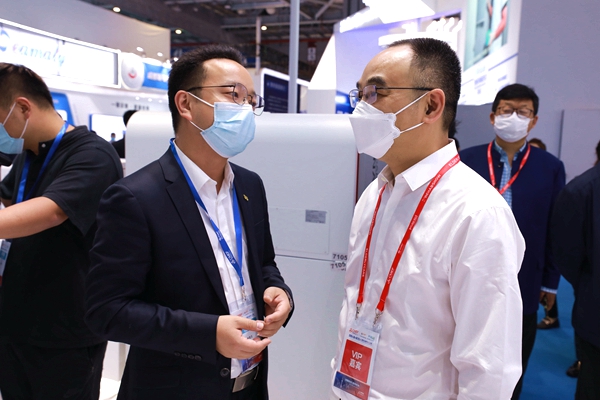 “這臺四通量iPonatic是單通量iPonatic的升級版,一次可同時檢測四個樣本”“該儀器集核酸提取、擴增檢測、報告打印于一體,DNA類項目檢測8-30分鐘出結果,新冠等RNA類項目檢測15-45分鐘出結果”……圣湘生物工作人員針對客戶的提問作出專業解答。