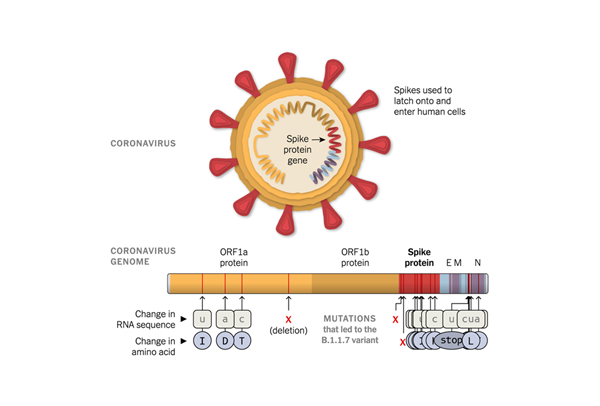 B.1.1.7新冠變異病毒示意圖(圖片來源:《紐約時報》)