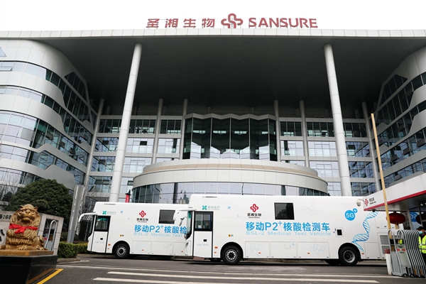 目前,北京、廣東、黑龍江、四川、山東等多省均已配置移動核酸檢測車。圣湘生物此次投入使用的移動P2+核酸檢測車共2臺,為湖南省首批投入使用的移動核酸檢測車,可實現采樣、檢測、報告一站式服務,2臺日檢測量(10混1)可達10萬人份,最快45分鐘內出結果!