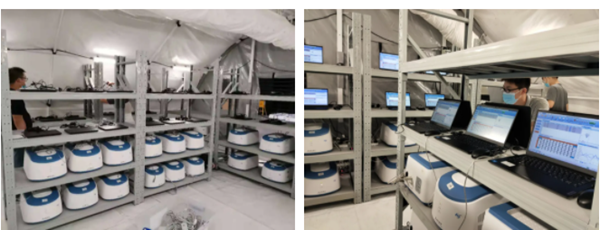 24日晚11點前,運輸團隊將“獵鷹號”氣膜實驗室所需要各類儀器、設(shè)備按時送達一線。隨后技術(shù)服務(wù)團隊無縫對接,連夜將儀器設(shè)備拆箱整理,兩班倒通宵為3組“獵鷹號”氣膜實驗室做前期準(zhǔn)備。