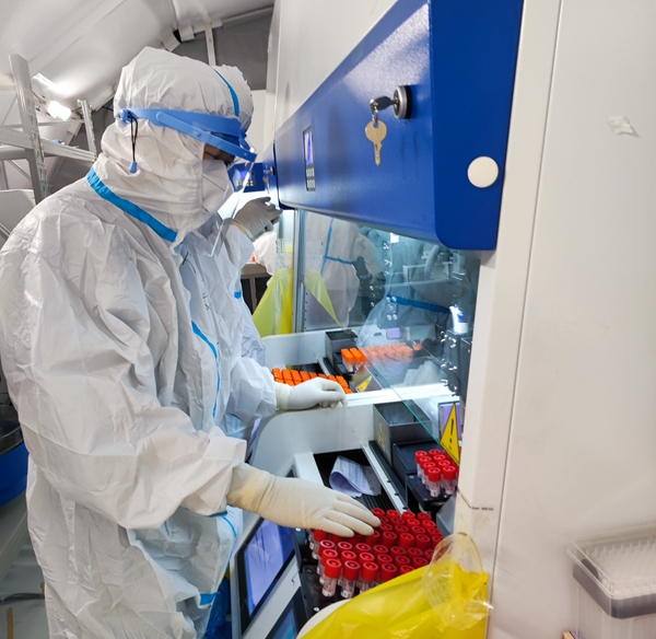 艙內核酸檢測——分工有條不紊,將采集到的樣本第一時間加樣、提取、擴增、出報告、醫療廢棄物滅菌。