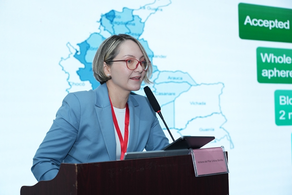 哥倫比亞紅會血庫醫(yī)學主任及羅薩里奧大學生物醫(yī)學科學系醫(yī)學與健康科學學院職業(yè)副教授Dr. Adriana Urbina發(fā)表了《哥倫比亞血篩的方法、現(xiàn)狀和未來趨勢》主題報告。她從哥倫比亞醫(yī)療制度及血站分布入手,探討了當前血篩項目的篩查方法及其挑戰(zhàn),強調(diào)了血篩核酸檢測具有優(yōu)越性,能廣泛識別病原體突變株,降低感染風險,確保血液安全。同時,她提出了利用分子方法學篩查蟲媒病毒等創(chuàng)新思路,并對圣湘生物分子血篩檢測方案高度贊賞。