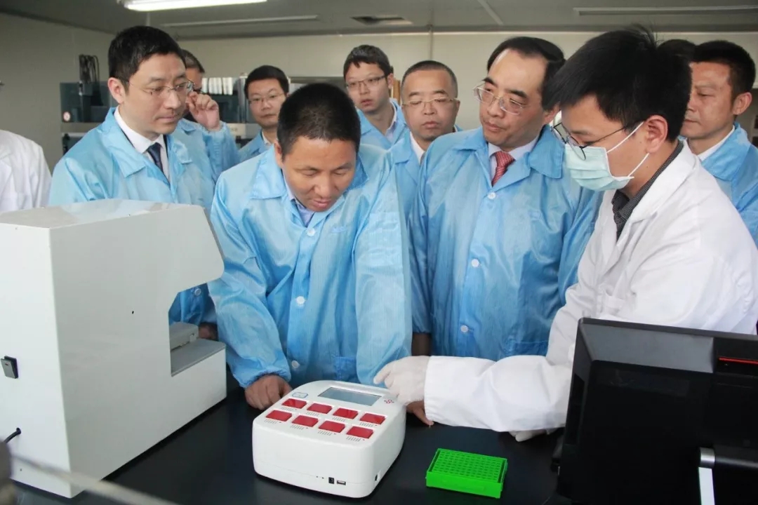 在研發實驗室,王建軍總經理一行深入了解了公司國際領先的技術和產品開發情況,特別對公司研發的POCT移動分子診斷系統、血篩試劑、適合大規模宮頸癌篩查的HPV檢測試劑給予了高度關注。對公司將分子診斷從傳統的主要應用于三甲醫院、獨立實驗室,拓展到基層醫院、健康管理、軍事管理、生物應急、動物衛生等領域,推動分子診斷應用普適化、全場景化,王建軍總經理給予了高度肯定。