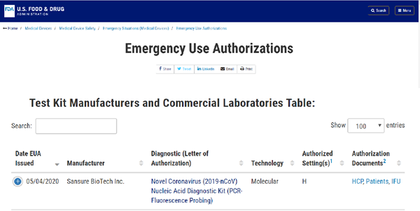 北京時(shí)間5月5日晚,圣湘生物新型冠狀病毒核酸檢測試劑盒獲美國食品藥品監(jiān)督管理局(FDA)緊急使用授權(quán)(EUA, Emergency Use Authorizations),這是該產(chǎn)品繼1月28日獲得中國國家藥監(jiān)局(NMPA)注冊認(rèn)證、3月3日獲得歐盟CE認(rèn)證后,圣湘生物獲得的又一重要認(rèn)證,將進(jìn)一步助力公司服務(wù)全球新冠肺炎疫情防控。